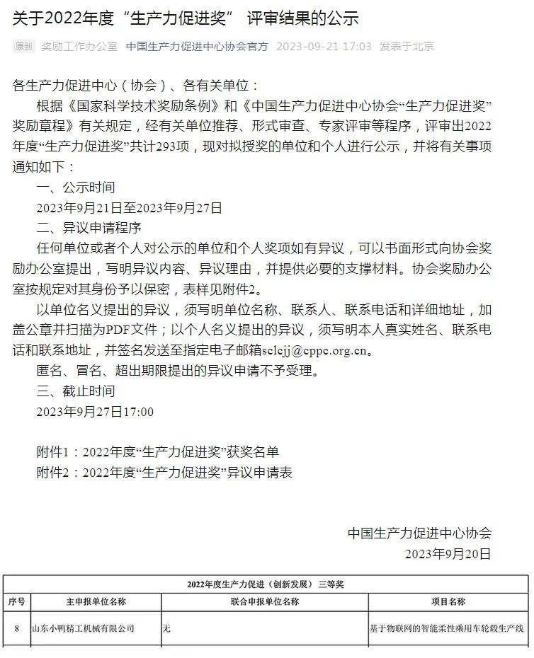 小鴨精工基于物聯(lián)網(wǎng)的智能柔性乘用車輪轂生產(chǎn)線憑借著傳感技術的應用和數(shù)據(jù)分析處理的能力榮獲中國生產(chǎn)力促進中心協(xié)會生產(chǎn)力促進獎三等獎。該項目是國際首條應用深度學習的視覺目標識別、激光掃描技術、六軸機器人與3D工業(yè)相機集成、物聯(lián)網(wǎng)在生產(chǎn)線的嵌入式應用等先進智能手段的自動化輪轂生產(chǎn)線,先后獲國家發(fā)明專利2項,實用新型專利7項,軟件著作權6項。